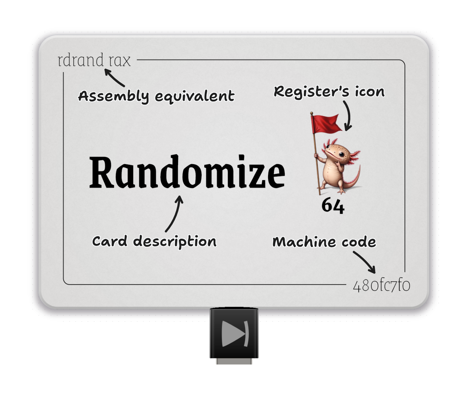 At the same time the representation tries to stay faithful to the underlying x86-64 CPU model - the instructions still show the assembly mnemonic & machine code in the corners of the card - but they do so in a way that passes as visual ornament rather than the main interface.